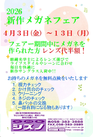 2026新作メガネフェア2026新作メガネフェア 4月3日(金)~13日(月) フェア期間中メガネを作られた レンズ代半額! 眼鏡光学士によるレンズ選びで ライフスタイルに合...